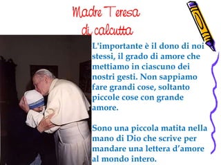 L'angolo della poesia: "Donna" di Madre Teresa di Calcutta A scriverli è stata una delle donne più straordinarie di tutti i tempi: Madre Teresa di Calcutta. - Donna Tieni sempre presente che la pelle fa le rughe, i capelli diventano bianchi, i giorni si trasformano in anni… Però ciò che è importante non cambia; la tua forza e la tua convinzione non hanno età. L'ultimo testamento spirituale di Madre Teresa, 25 anni dopo L'ultima lettera generale di Madre Teresa alle Missionarie della Carità fu scritta 25 anni fa, il 5 settembre 1997, esattamente il giorno della sua morte, dalla Casa Madre delle Missionarie della Carità a Kolkata. La Madre aveva iniziato il suo viaggio di ritorno a casa, quindi non ebbe il tempo di firmare la lettera. Madre Teresa di Calcutta: 20 frasi celebri da legegre Le frasi celebri di Madre Teresa di Calcutta Per ricordare l'incredibile lavoro svolto da Madre Teresa di Calcutta e i suoi insegnamenti sull'amore verso il prossimo, abbiamo raccolto in questo articolo le sue frasi più profonde e ricche di significato. Amore L'amore è l'unica risposta alla solitudine. Madre Teresa Di Calcutta Crea Copia FrasiX